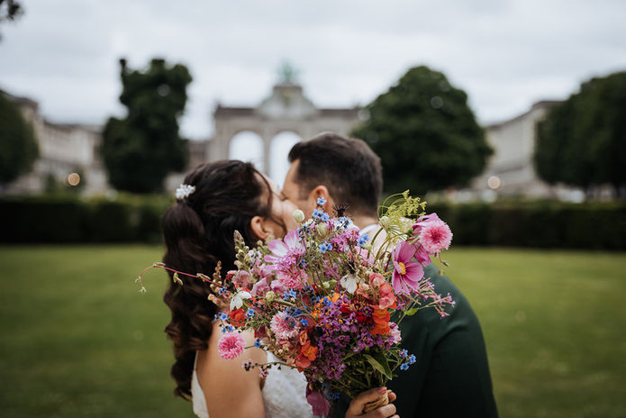 De bruid vroeg om kleurrijke en duurzame bloemen. Het was spannend tot op het laatste moment kon de ceremonie uiteindelijk na een drasche nationale toch doorgaan in het bos rond Chalet Robinson in Brussel Fotograaf: Min Huy
